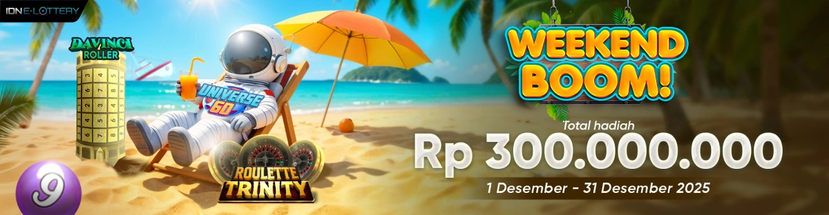Weekend Boom! oleh IDN E-Lottery akan berlangsung mulai 1 Desember 2025 hingga 31 Desember 2025 setiap hari, pukul 00:00 WIB hingga 23:59 WIB. Total hadiah cash drop adalah sebesar Rp 300,000,000 dan akan dibagikan kepada pemain yang beruntung setiap harinya.